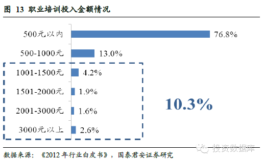 職業培訓行業快速發展主要受益於20-40歲之間已工作人士接受培訓教育的用戶規模和付費水平的雙重提升。目前接受在線職業培訓的工作人士僅佔整體的10%,到2017年滲透率有望提升至20%。除此之外,用戶的平均付費水平有望進一步提升,人均付費金額將從400元提升至670元,行業整體規模未來五年從230億元翻升至800億元。