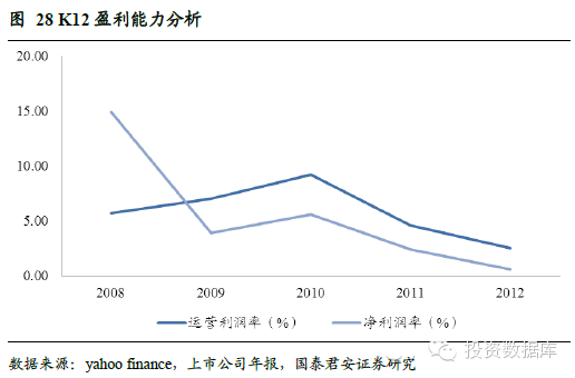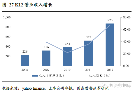 K12 國際教育成立於2000年四月,目前是美國最大的在線教育公司之一,為從幼兒園到12年級的學生提供專有的課程和教育服務,同時為相關學校提供課程、軟件、管理系統和管理的一站式運營外包服務。自成立以來K12國際教育始終保持快速發展,公司於2008年成功在紐交所上市,據2012年年報顯示,公司2012年營業收入為8.73億美元,同比增長67.2%,淨利潤為550萬美元。