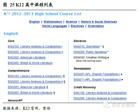 目前美國領先的K12教育服務提供商包括K12國際教育、ConnectionAcademy和White Hat Management等。其中規模最大的為K12國際教育(見附錄1),K12為美國40多個州的教育署提供在線教育平台和解決方案,為在線教育機構提供各種類型的學術支持服務(教師培訓、學業規劃等)和虛擬校園管理服務(一站式服務、虛擬校園管理和財務管理)。2011年共有8萬餘名學生接受K12提供的虛擬基礎教育,這一數字目前仍在以每年20%以上的速度增長。