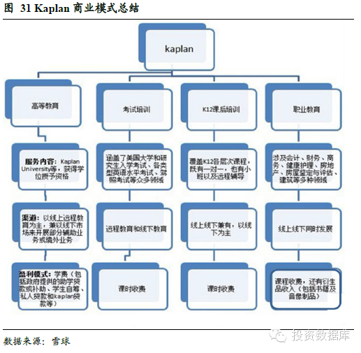 Kaplan 主要包括考試培訓、職業教育、K12教育和高等教育四大板塊,一言以蔽之即從小學到大學到職業培訓的“終身教育平台”。