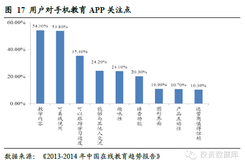 移動端在線教育規模將實現快速增長。一方面,移動終端更好延展在線教育優勢;另一方面,用戶具有為手機在線教育的支付意識。《2013-2014年中 國在線教育趨勢報告》報告顯示,移動端在學習進度、語音互動、無需聯網、界面設計等方面優於PC端線上教育。56%的用戶有意願為手機在線教育APP付費,反映出用戶具有為優質內容付費的意識。願意付費的用戶中,大多數人(約50%)可接受的產品價格在10元以內,這與大多數收費手機應用的價格區間接近。