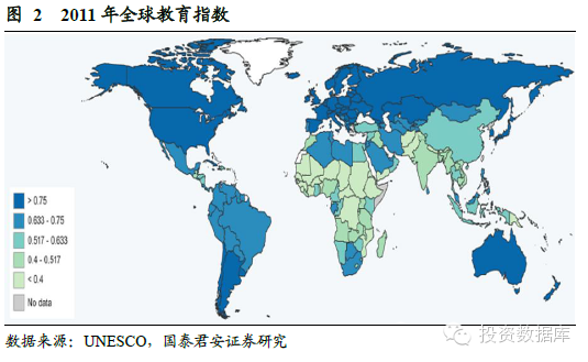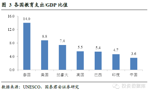 我國教育行業投入與GDP的比值僅為3.6%,是發達國家的一半左右,與印度、泰國等發展中國家相比仍有較大差距。以美國為例,美國教育支出佔GDP整體的9%左右,是僅次於醫療的第二大支出組成。中國教育行業支出佔GDP整體的3.6%,僅為美國的40%,考慮到中國經濟的極大體量,考慮到美國教育體係比較成熟,我們與金磚四國的其他三個國家教育支出佔GDP的比例進行比較,同時考慮到未來我國GDP的快速增長,2017年時我國教育整體支出至少還有一倍的發展空間。