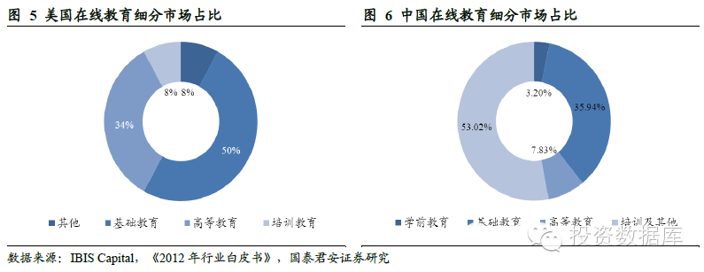 細分行業市場結構差別比較大。我國在線教育中佔比最大的為培訓教育(53.0%),其次為基礎教育(35.94%)。而美國在線教育中基礎教育比例接近50%,線上培訓業務反而僅為8%。