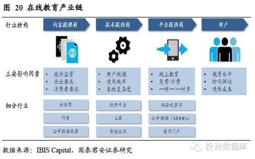 平台提供商佔據70%的在線教育市場份額。在線教育覆蓋面廣,形式多樣。按照產業鏈環節拆分,可以分為內容提供商、平台提供商和技術提供商三類。據IBISCapital報告推算,其中平台提供商的市場規模最大,約佔全球行業整體規模的70%;其次是技術提供商,約佔行業的21%;內容提供商的規模最小,僅佔行業整體的9 %左右。
