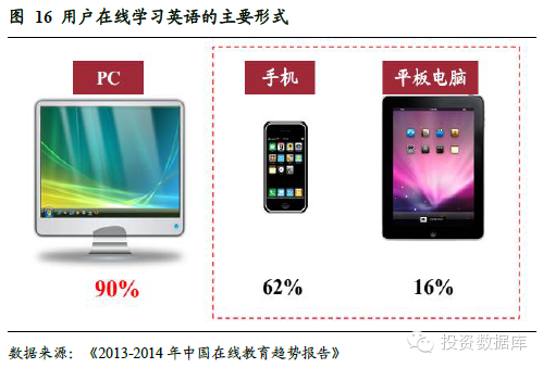 移動端學習日趨主流,《2013-2014年中國在線教育趨勢報告》,90%的在線教育用戶選擇PC端接受外語教學,移動端的使用率緊隨其後,62%的手機用戶會通過APP等形式通過手機學習外語。