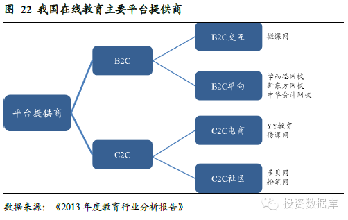 平台提供商旨在為內容提供商和終端用戶之間提供中介平台,並以線上機構為主,目前主要可分為B2C和C2C兩類。B2C模式指教育機構直接向用戶提供有償服務,根據用戶互動程度又可分為交互式和單向兩種。C2C模式指個人為用戶提供教育服務,依據盈利模式可分為C2C電商和C2C社區兩種形式。