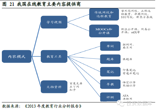 在線教育內容提供商主要提供教學資料(講義、課件、音頻、視頻等)和輔助教學工具類產品。從內容上可進一步拆分為學習視頻、教育工具和文檔資料三部分,其中學習視頻行業規模較大,教育工具行業發展速度相對較快。