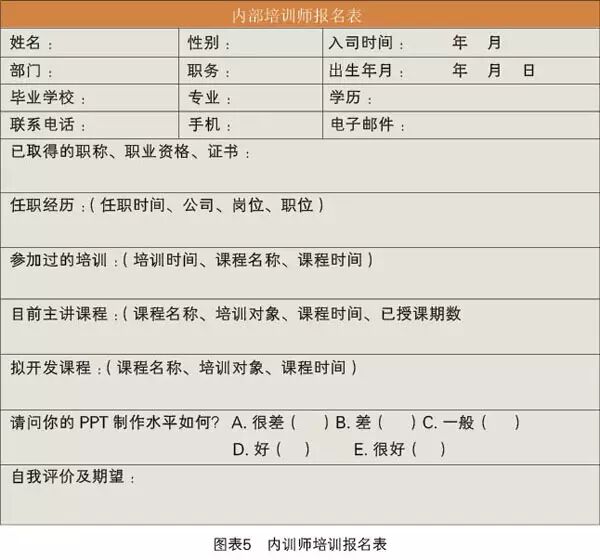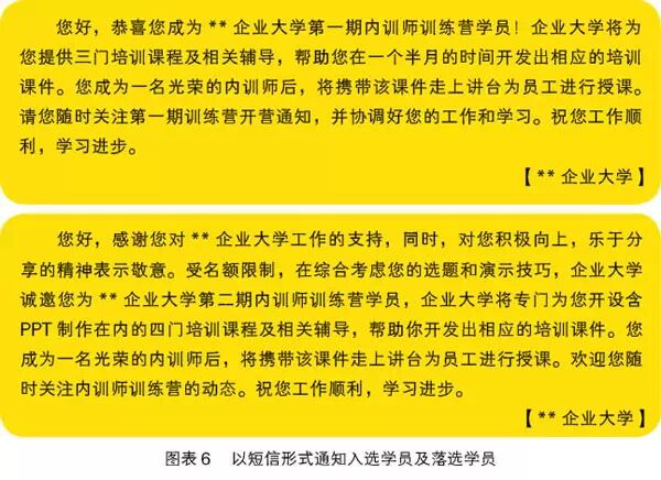 為了便於培訓組織者了解學員的現有水平,並設計出更有針對性的培養方案,報名人員除了需登記常規的個人信息外 ,也要清楚地填寫已有或擬開發的課程以及製作PPT的水平(見圖表5)。內部培訓師報名表應先上報公司企業大學,進行初步審核。企業大學選拔 經過初步審核之後,企業大學將組織人員依據已有選拔標準,從所有報名者中篩選出符合條件的員工作為潛在學員;同時,將組織潛在學員進行課程試講,初步了解學員在授課方面的基礎能力。與候選學員進行面談 根據以上條件進行篩選,一些人員會直接被淘汰,也會存在一些報名人員個別條件不完全符合,成為待定學員。這時候,項目組將與待定學員進行面談,進一步展開篩選。確定最終入選學員 選拔結束之後,企業大學將與各部門領導進行溝通,確認內訓師培養的最終名單。 通過以上步驟初步擬定內訓師名單,與有關部門領導進行溝通,從而確定內訓師學員最終名單。名單確定後,還需要進行以下兩項工作(可通過短信發送的形式):1.告知入選學員做好培訓準備; 2.對落選的報名人員進行安撫工作(見圖表6)。 項目組對所有報名學員進行約談,及時通知入選人員準備參加培訓活動;同時,也對沒有入選的員工進行反饋,幫助分析其能力缺陷。 後續的工作重心,就是針對入選學員開展針對性培養工作,尤其是學員課件開發能力和授課技巧的強化訓練,幫助他們勝任內訓師一職。