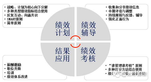 現代績效管理是個完整的、循環往復的閉環體系,分為績效計劃、績效輔導、績效評價/考核、結果應用四個環節,其核心目的是使公司和員工發展進入“目標實現和績效持續改進的良性循環”。其閉環體系如下圖所示: