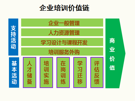 需要指出的是,企業培訓供給側並非只是我們常說的乙方培訓供應商,從培訓價值鏈分析(如下圖),所有為培訓活動提供支持的利益相關方,均可視為供給側。因此企業培訓供給側,不僅包括外部的培訓供應商,還應包括企業人力資源和培訓部門。
