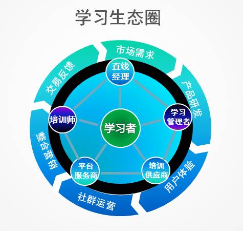 在學習生態圈理念中,培訓市場應以企業用戶(學習者)為中心,加強學習管理者、直線經理、培訓供應商、平台服務商和講師顧問之間的連接,通過用戶體驗、社群運營、整合營銷等方式,促進資源共享、需求開發和產品迭代,最終產生商業價值。