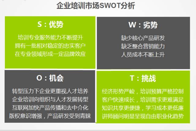 總體看來,培訓供給側的優勢和劣勢都很明顯,主要優勢表現為專業服務能力得到提升,已經得到部分客戶和用戶認可,並取得一定品牌效應;劣勢主要表現為缺少核心產品,產品整合營銷能力不足和內部運營成本上升。